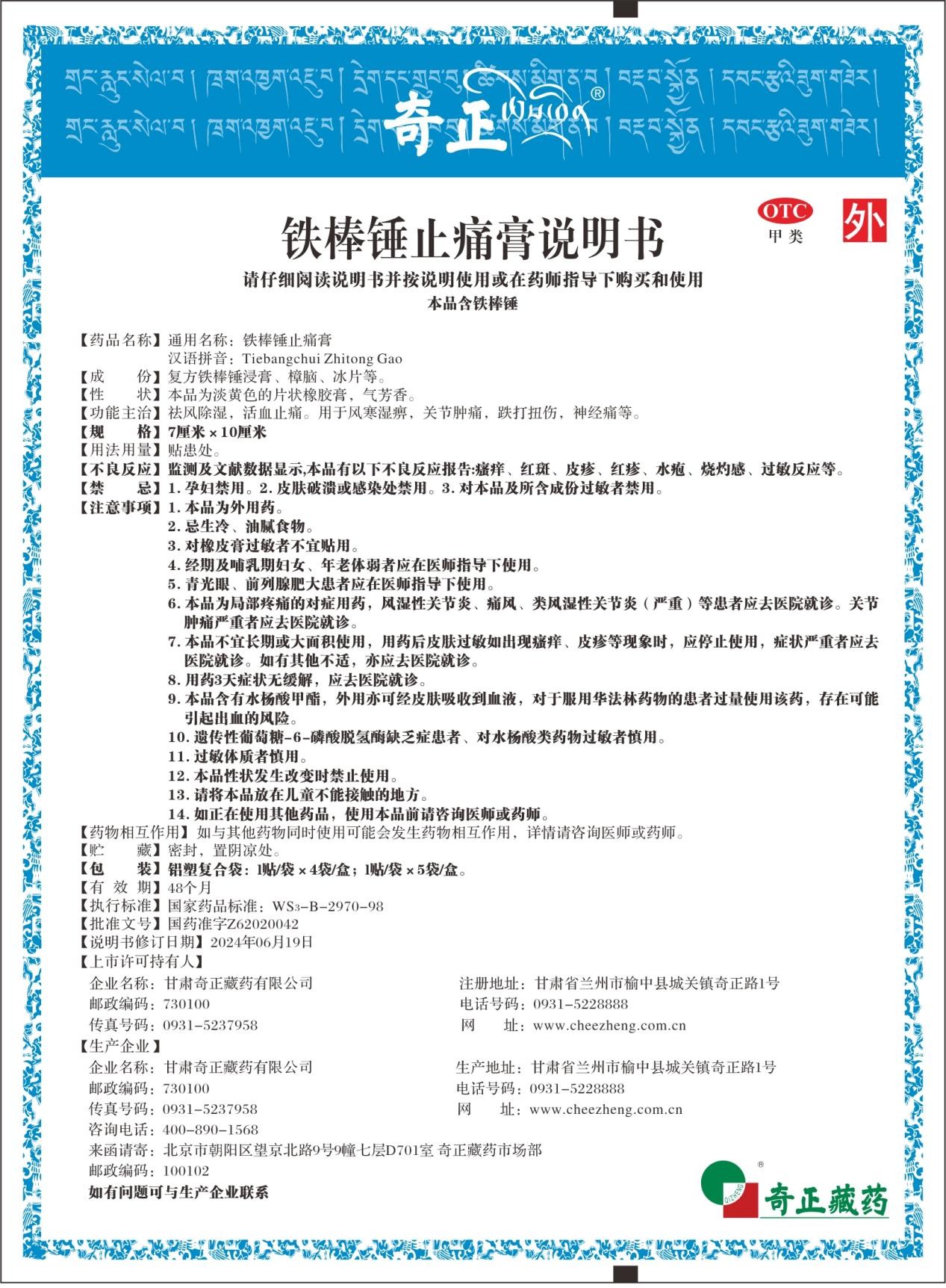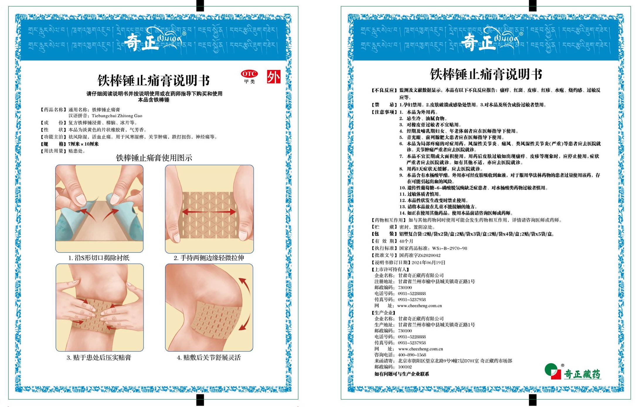 甘肅奇正藏藥有限公司按照鐵棒錘止痛膏獲批的《國家藥品監(jiān)督管理局藥品補充申請批準通知書》(編號:2024B00600)內容,對鐵棒錘止痛膏藥品說明書中的【不良反應】、【禁忌】和【注意事項】進行了修訂及備案,現(xiàn)將新版說明書予以發(fā)布,如您需要更為詳細的信息或有特定的問題,可以聯(lián)系客服400-890-1568或撥打企業(yè)電話:0931-5228888。